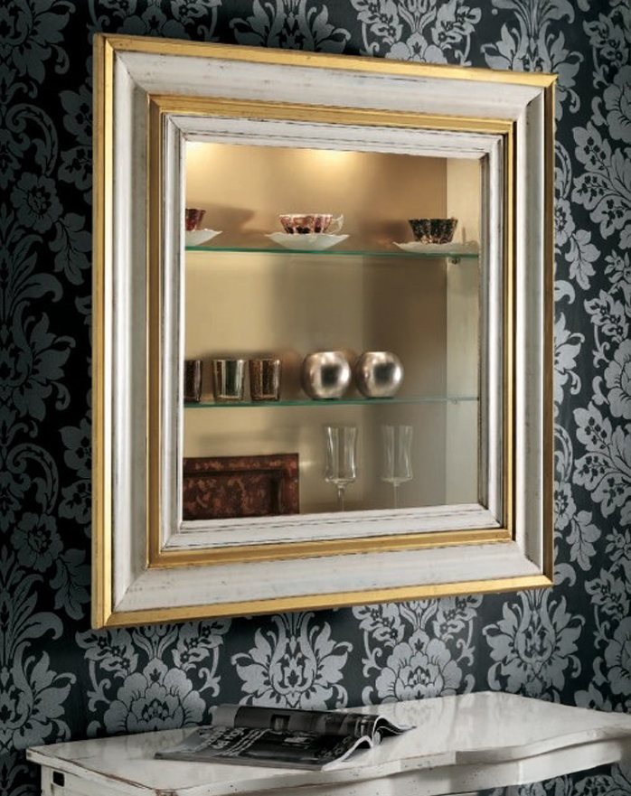 Wall-mounted display unit with glass shelves and lighting